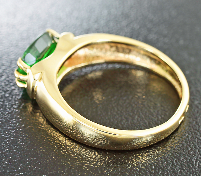 Вашему вниманию предлагается кольцо из желтого золота 585 пробы с цаворитом гранатом! Площадка 10 х 7 мм, высота 6 мм. Вес изделия 3,6 г. Размер 17. Ниже приводятся ювелирные характеристики.