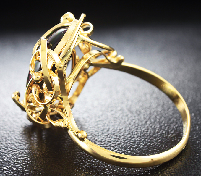 Вашему вниманию предлагается кольцо из желтого золота 585 пробы с кристаллическим черным опалом и 6 бриллиантами! Диаметр дополнительной инкрустации 1 мм и 1,5 мм. Площадка 23 х 18 мм, высота 9 мм. Вес изделия 5,9 г. Размер 19,5. Ниже приводятся ювелирные характеристики опала.