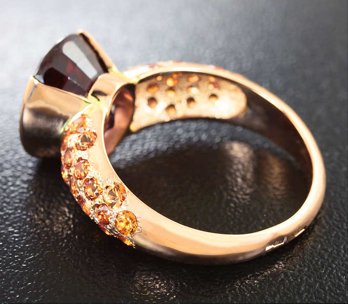 Вашему вниманию предлагается кольцо из розового золота 585 пробы с крупным оранжевым цирконом и сапфирами! Диаметр дополнительной инкрустации 2 мм. Площадка 21 х 12 мм, высота 8 мм. Вес изделия 5,96 г. Размер 17. Ниже приводятся ювелирные характеристики циркона.