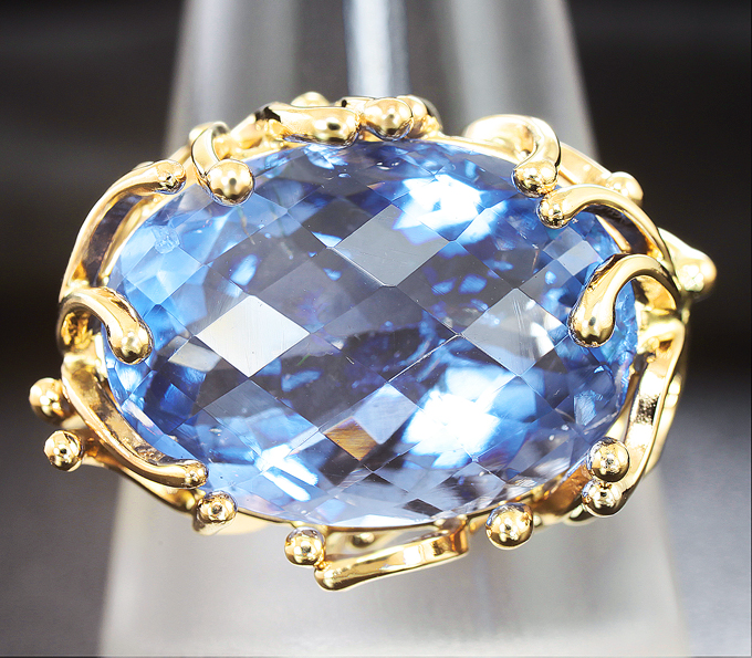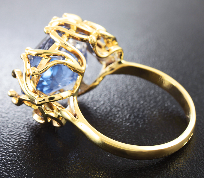 Вашему вниманию предлагается кольцо из желтого золота 585 пробы с флюоритом! При смене освещения камень меняет цвет с синего на пурпурный. Площадка 24 х 17 мм, высота 12 мм. Вес изделия 9,9 г. Размер 20. Ниже приводятся ювелирные характеристики вставки.