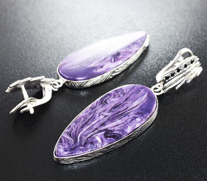 Вашему вниманию предлагаются серьги из стерлингового серебра (925 проба) с чароитами топового качества и черными шпинелями! Диаметр дополнительной инкрустации 1,5 мм. Размеры серег с петлей 57 х 17 мм. Вес пары 11,7 г. Ниже приводятся ювелирные характеристики чароитов.