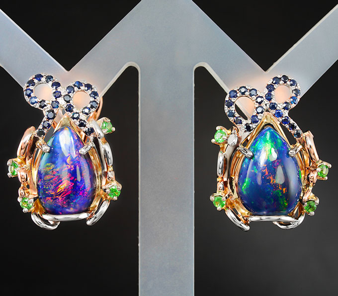 Серьги с кристаллическими черными опалами, синими сапфирами и цаворитами гранатами