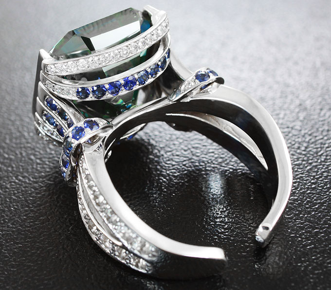 Кольцо с муассанитом эксклюзивного размера, бриллиантами, голубыми и бесцветными сапфирами