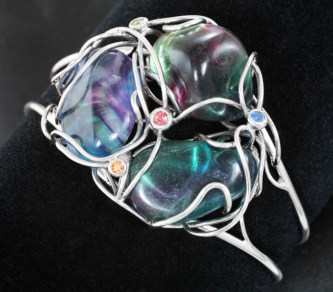 Вашему вниманию предлагается браслет из стерлингового серебра (925 проба) с разноцветными флюоритами и сапфирами! Диаметр дополнительной инкрустации 2,5 мм. Длина браслета по окружности 170 мм, ширина 38 мм. Вес изделия 36,7 г. Ниже приводятся ювелирные характеристики флюоритов.