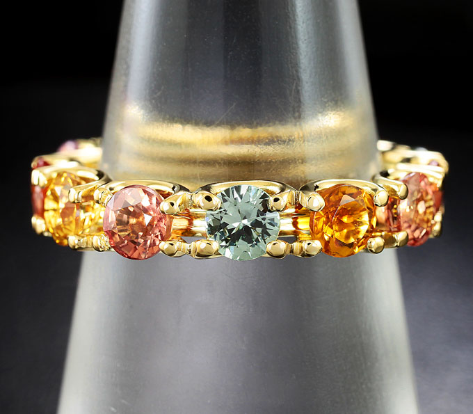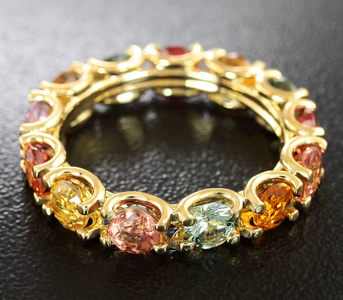 Вашему вниманию предлагается кольцо из желтого золота 750 пробы с разноцветными сапфирами! Диаметр вставок 4 мм. Ширина площадка 4 мм, высота 3 мм. Вес изделия 4,4 г. Размер 17,5. Ниже приводятся ювелирные характеристики вставок.