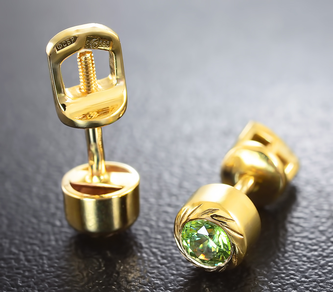 Вашему вниманию предлагается комплект (пусеты + кулон) из желтого золота 585 пробы с уральскими демантоидами! Вес комплекта 2,9 г.