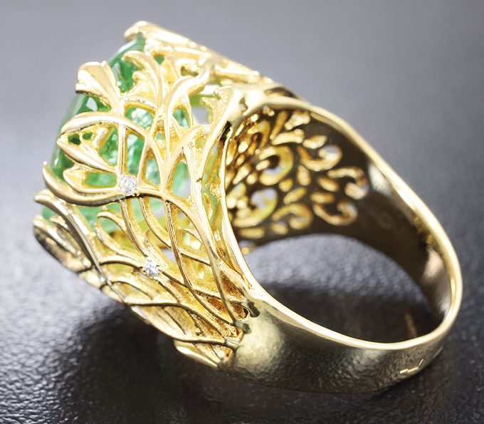 Вашему вниманию предлагается кольцо из желтого золота 585 пробы с крупным параиба турмалином и бриллиантами! Диаметр дополнительной инкрустации 1,1 мм. Площадка 18 х 16 мм, высота 12 мм. Вес изделия 10 г. Размер 16,5. Ниже приводятся ювелирные характеристики турмалина.
