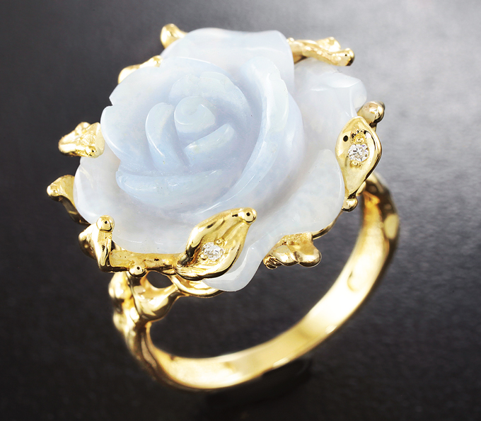 Вашему вниманию предлагается кольцо из желтого золота 585 пробы с резным халцедоном и бриллиантами! Диаметр дополнительной инкрустации 1,1 мм. Площадка 20 х 19 мм, высота 10 мм. Вес изделия 6,4 г. Размер 17,5. Ниже приводятся ювелирные характеристики халцедона.