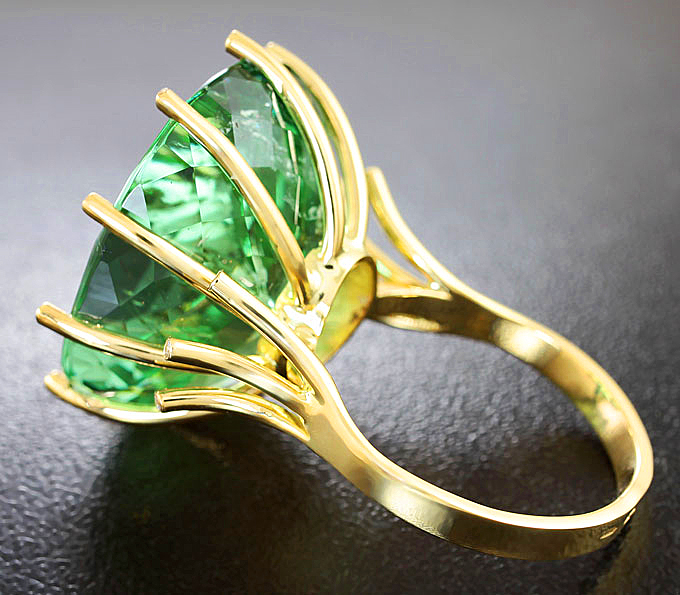 Вашему вниманию предлагается кольцо из желтого золота 585 пробы с крупным турмалином и бриллиантами! Диаметр дополнительной инкрустации 1,1 мм. Площадка 25 х 24 мм, высота 14 мм. Вес изделия 13,7 г. Размер 20. Ниже приводятся ювелирные характеристики турмалина.