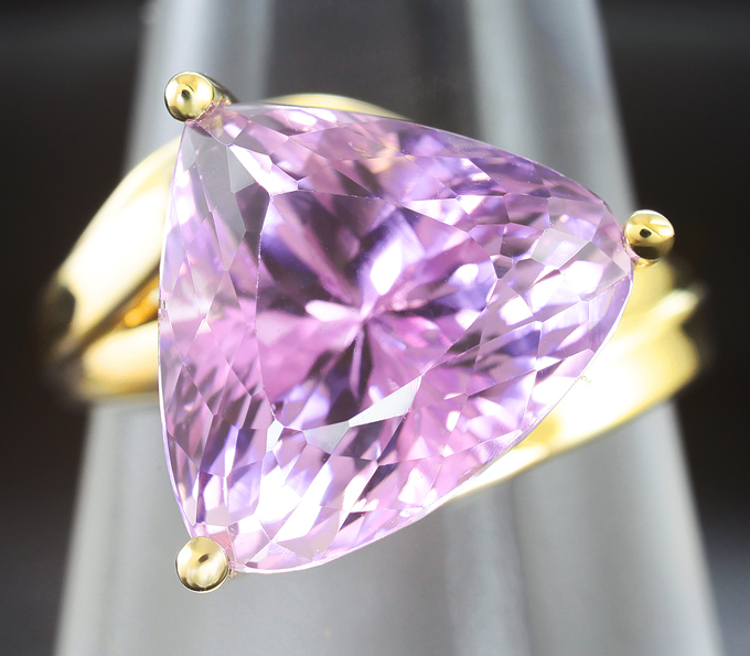 Вашему вниманию предлагается кольцо из желтого золота 585 пробы с насыщенным пурпурно-розовым кунцитом! Площадка 14 х 14 мм, высота 13 мм. Вес изделия 6,9 г. Размер 18,5. Ниже приводятся ювелирные характеристики вставки.