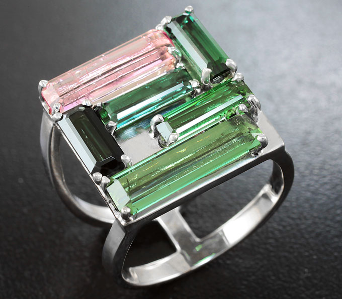 Вашему вниманию предлагается кольцо из стерлингового серебра (925 проба) c разноцветными турмалинами! Площадка 17 х 17 мм, высота 4 мм. Вес изделия 7,9 г. Размер 18,25. Ниже приводятся ювелирные характеристики вставок.