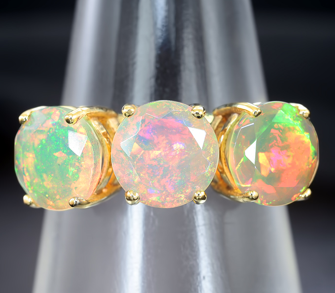 Вашему вниманию предлагается кольцо из желтого золота 585 пробы с ограненными эфиопскими опалами! Основные цвета опалесценции: красный, желтый и зеленый. Площадка 21 х 7 мм, высота 5 мм. Вес изделия 3,19 г. Размер 17,25. Ниже приводятся ювелирные характеристики вставок.