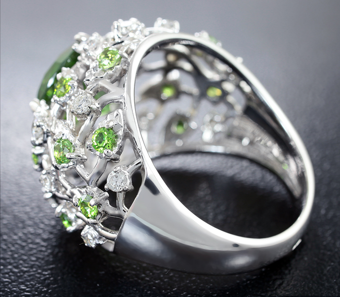 Кольцо с топовым уральским демантоидом гранатом, малыми демантоидами и бриллиантами