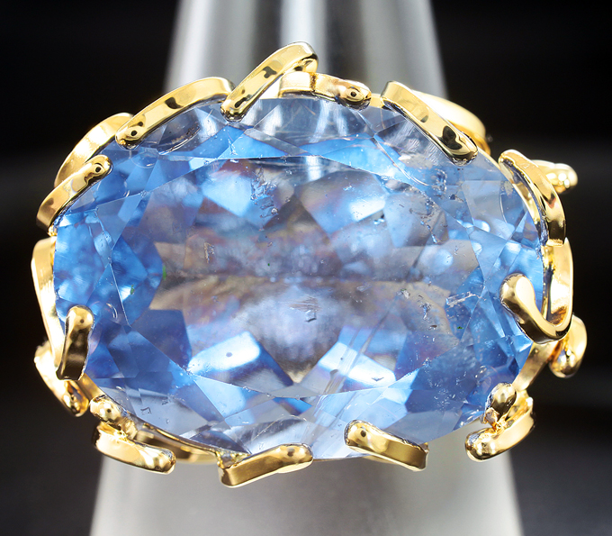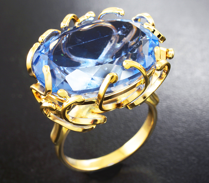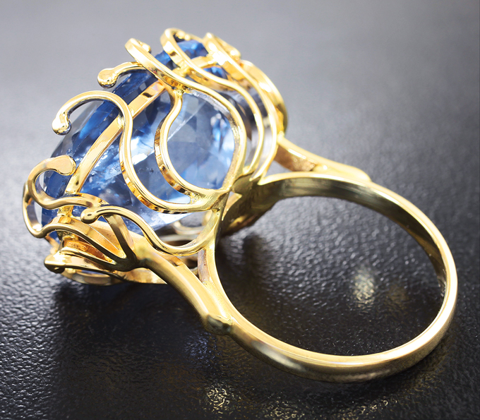 Вашему вниманию предлагается кольцо из желтого золота 585 пробы с флюоритом! При смене освещения камень меняет цвет с синего на фиолетовый. Площадка 26 х 20 мм, высота 14 мм. Вес изделия 13,9 г. Размер 19. Ниже приводятся ювелирные характеристики вставки.