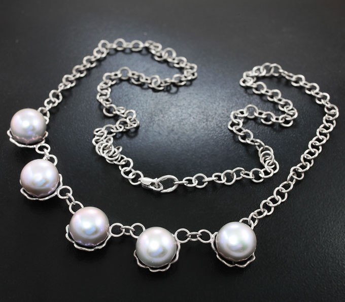 Вашему вниманию предлагается колье из стерлингового серебра (925 проба) с цветным морским жемчугом массой 56,59 карата! Диаметр вставок 12 мм. Длина по цепочке 590 мм. Вес изделия 25,5 г.