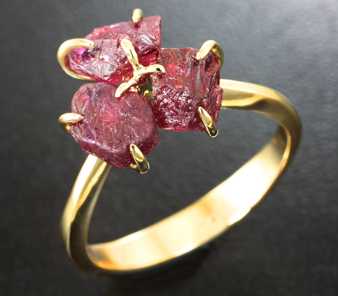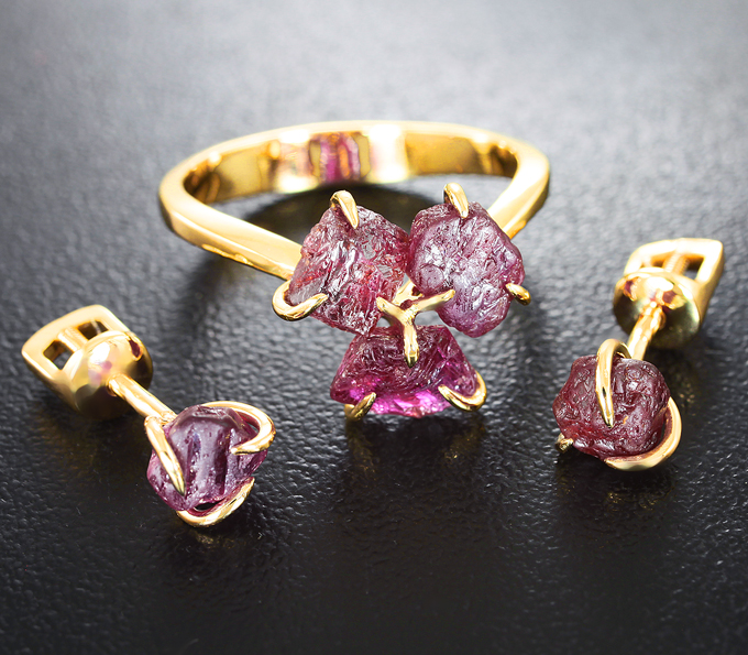 Вашему вниманию предлагается комплект (кольцо + пусеты) из желтого золота 585 пробы с необработанными рубинами! Вес комплекта 5,1 г.