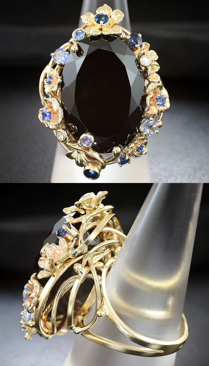 Вашему вниманию предлагается комплект (кольцо + серьги + кулон) из желтого золота 585 пробы с черными шпинелями массой 114,8 карата, танзанитами, синими и бесцветными сапфирами! Размеры вставок от 1 мм до 25 х 18 мм. Вес комплекта 66,4 г.