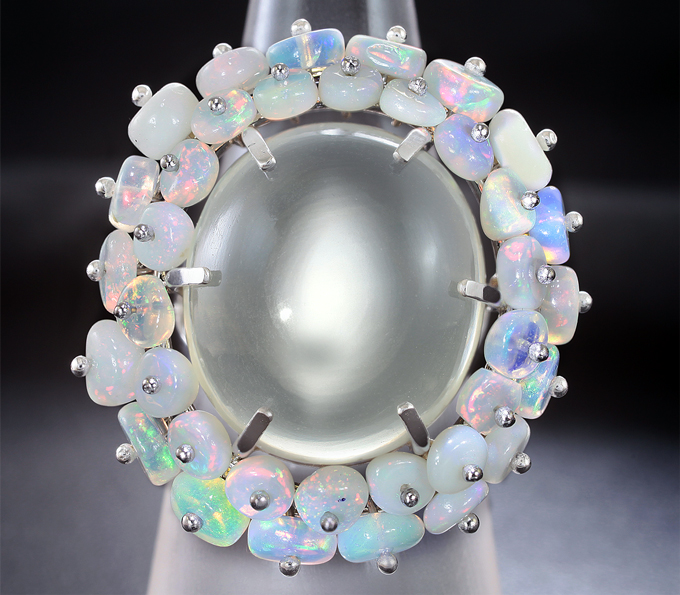 Вашему вниманию предлагается кольцо из белого золота 585 пробы c лунным камнем с эффектом кошачьего глаза и опалами! Основные цвета опалесценции: красный, зеленый и синий. Размеры опалов 4 х 3 мм. Площадка 31 х 29 мм, высота 13 мм. Вес изделия 11,2 г. Размер 16,75. Ниже приводятся ювелирные характеристики вставки.