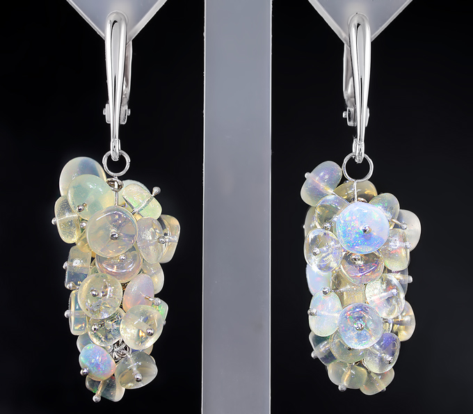 Вашему вниманию предлагаются серьги из белого золота 585 пробы с кристаллическими эфиопскими опалами! Основные цвета опалесценции: красный, желтый, зеленый и синий. Диаметр вставок от 4 мм до 6 мм. Размеры серег с петлей 44 х 14 мм. Вес пары 8,5 г.