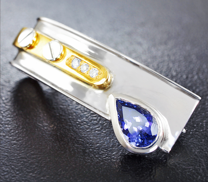 Вашему вниманию предлагается брошь-кулон из стерлингового серебра (925 проба) с танзанитом и бриллиантами! Изделие частично позолочено. Диаметр дополнительной инкрустации 1,5 мм. Площадка изделия 32 х 12 мм. Вес изделия 6,8 г. Ниже приводятся ювелирные характеристики танзанитом.