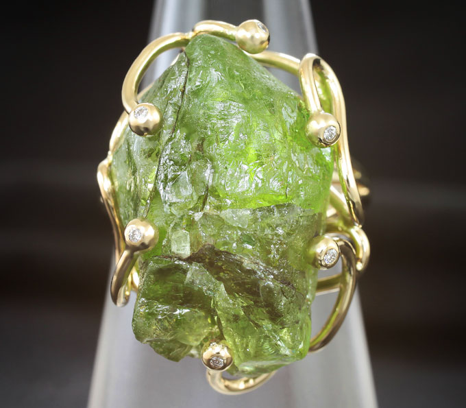 Вашему вниманию предлагается кольцо из желтого золота 585 пробы с необработанным перидотом и бриллиантами! Диаметр дополнительной инкрустации 1,1 мм. Размеры вставок 22 х 13 мм. Площадка 25 х 18 мм, высота 13 мм. Вес изделия 9,6 г. Размер 17. Ниже приводятся ювелирные характеристики перидота.