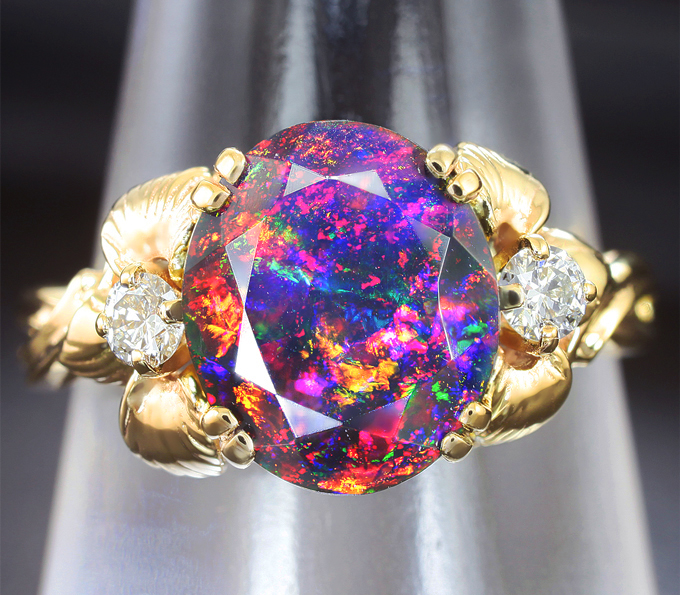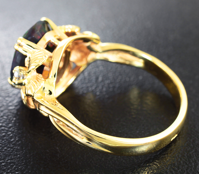 Вашему вниманию предлагается кольцо из желтого золота 585 пробы с ограненным черным опалом и бриллиантами! Основные цвета опалесценции: красный, желтый, зеленый, фиолетовый и синий. Диаметр дополнительной инкрустации 2,6 мм. Площадка 15 х 10 мм, высота 7 мм. Вес изделия 4,8 г. Размер 18. Ниже приводятся ювелирные характеристики опала.