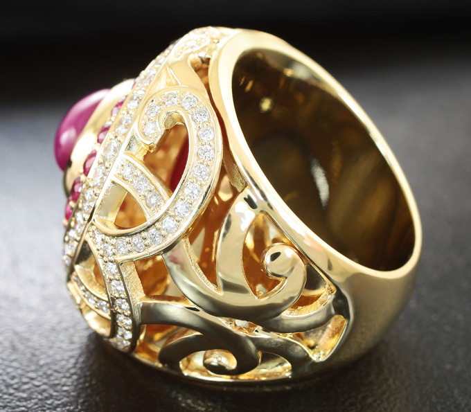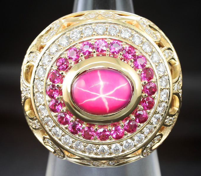 Кольцо со звездчатым рубином, ограненными рубинами и бриллиантами