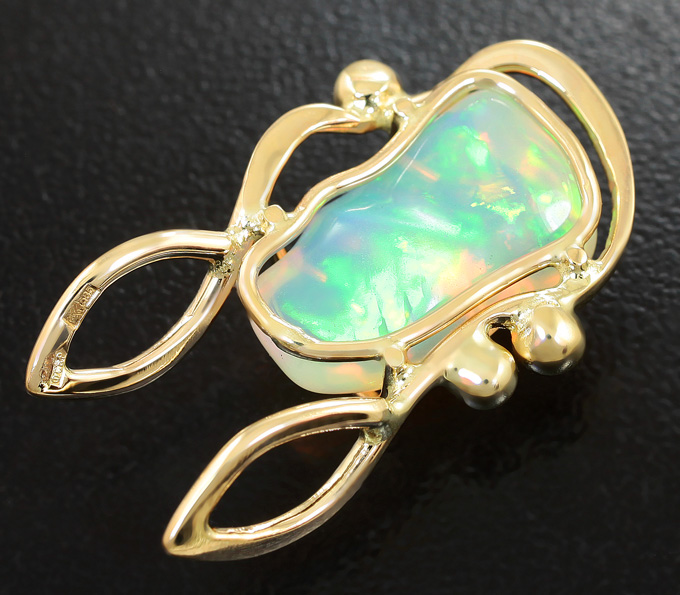 Вашему вниманию предлагается кулон из желтого золота 585 пробы с кристаллическим эфиопским опалом и бесцветными сапфирами! Основные цвета опалесценции: синий и зеленый. Диаметр дополнительной инкрустации 2 мм. Площадка кулона 27 х 11 мм. Вес изделия 2,9 г. Ниже приводятся ювелирные характеристики опала.