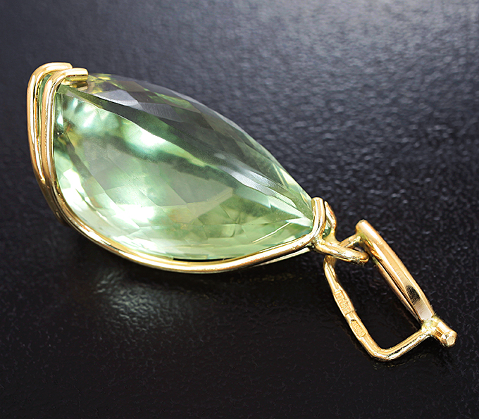 Вашему вниманию предлагается кулон из желтого золота 585 пробы с чистейшим зеленым аметистом! Размеры кулона с петлей 39 х 16 мм. Вес изделия 6,9 г. Ниже приводятся ювелирные характеристики вставки.