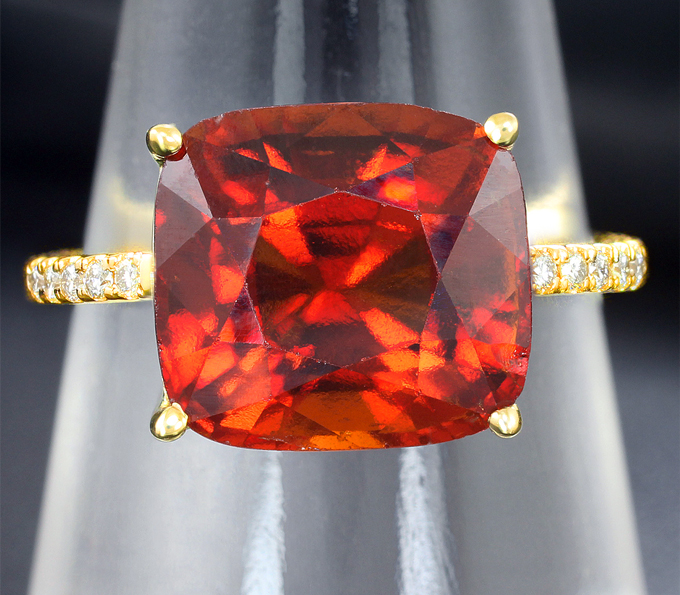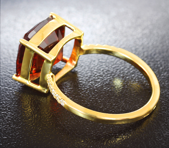 Вашему вниманию предлагается кольцо из желтого золота 585 пробы c гессонитом гранатом и бриллиантами! Диаметр дополнительной инкрустации 1,3 мм. Площадка 21 х 11 мм, высота 8 мм. Вес изделия 4,2 г. Размер 17,5. Ниже приводятся ювелирные характеристики граната.