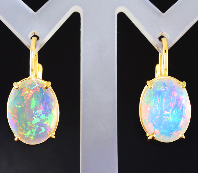 Вашему вниманию предлагаются серьги из желтого золота 585 пробы с крупными ограненными эфиопскими опалами! Основные цвета опалесценции: красный, желтый, зеленый и синий. Размеры серег с петлей 23 х 11 мм. Вес пары 5,2 г. Ниже приводятся ювелирные характеристики вставок.
