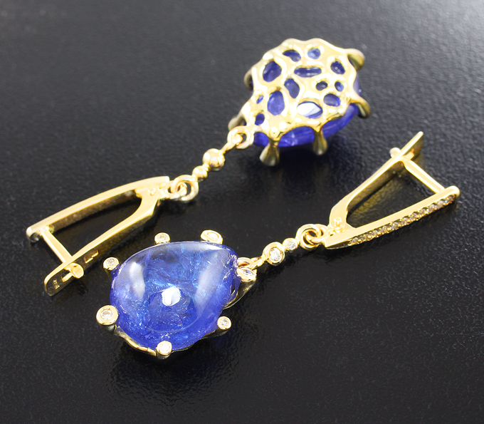 Вашему вниманию предлагаются серьги из желтого золота 585 пробы с танзанитами 25,47 карата и бриллиантами! Размеры танзанитов 15 х 12 мм, диаметр бриллиантов 1,1 мм и 1,5 мм. Размеры серег с петлей 46 х 14 мм. Вес пары 10,74 г.