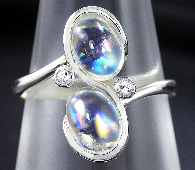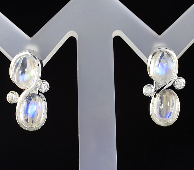 Вашему вниманию предлагается комплект (кольцо + серьги) из стерлингового серебра (925 проба) с лунным камнем и лейкосапфирами! Размеры вставок 1,5 мм и 7 х 5 мм. Вес комплекта 7,9 г.