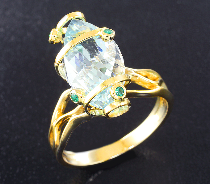 Вашему вниманию предлагается комплект (кольцо + серьги) из желтого золота 585 пробы с аквамаринами 25,4 карата и изумрудами! Размеры аквамаринов 18 х 9 мм мм и 20 х 7 мм, диаметр дополнительной инкрустации от 1,5 мм до 3 мм. Вес комплекта 15 г.