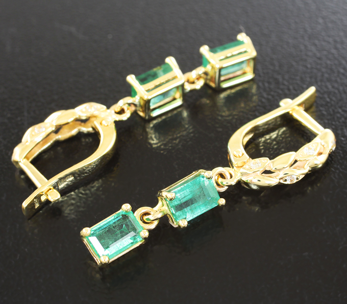 Вашему вниманию предлагаются серьги из желтого золота 585 пробы с уральскими изумрудами 1,91 карата и бесцветными цирконами! Размеры вставок 1 мм и 5 х 4 мм. Размеры серег с петлей 30 х 4 мм. Вес пары 3,2 г.
