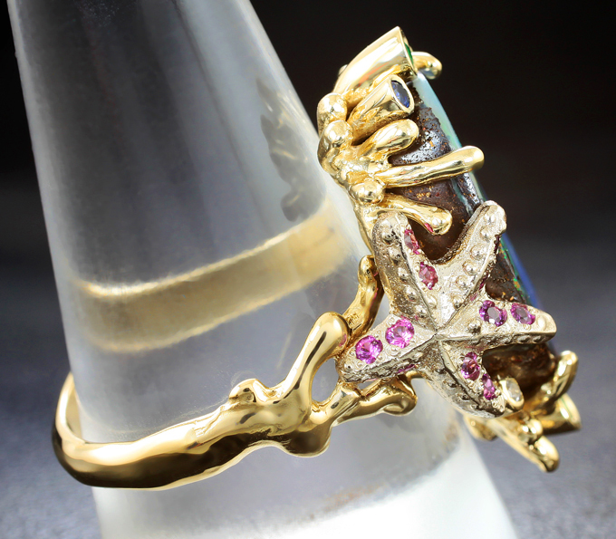 Кольцо с австралийским болдер опалом 13,48 карата, изумрудами, розовыми, синими и бесцветными сапфирами