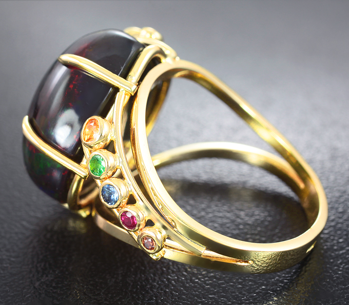 Кольцо с кристаллическим черным опалом 15,14 карата, разноцветными сапфирами и цаворитами гранатами