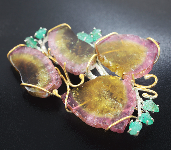 Брошь c крупными слайсами полихромных турмалинов