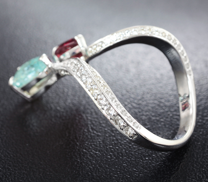 Кольцо с медьсодержащим голубым параиба турмалином, рубином и лейкосапфирами