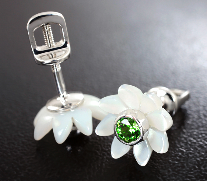 Пусеты с уральскими демантоидами 0,36 карата и перламутром