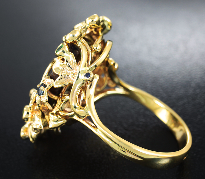 Вашему вниманию предлагается кольцо из желтого золота 585 пробы с австралийским болдер опалом, цаворитами гранатами и синими сапфирами! Основные цвета опалесценции: синий и зеленый. Диаметр дополнительной инкрустации от 1,2 мм до 2 мм. Площадка 27 х 22 мм, высота 8 мм. Вес изделия 10,8 г. Размер 20,25. Ниже приводятся ювелирные характеристики опала.