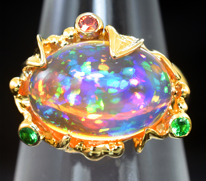 Кольцо c кристаллическим эфиопским опалом, оранжевым сапфиром и цаворитами гранатами