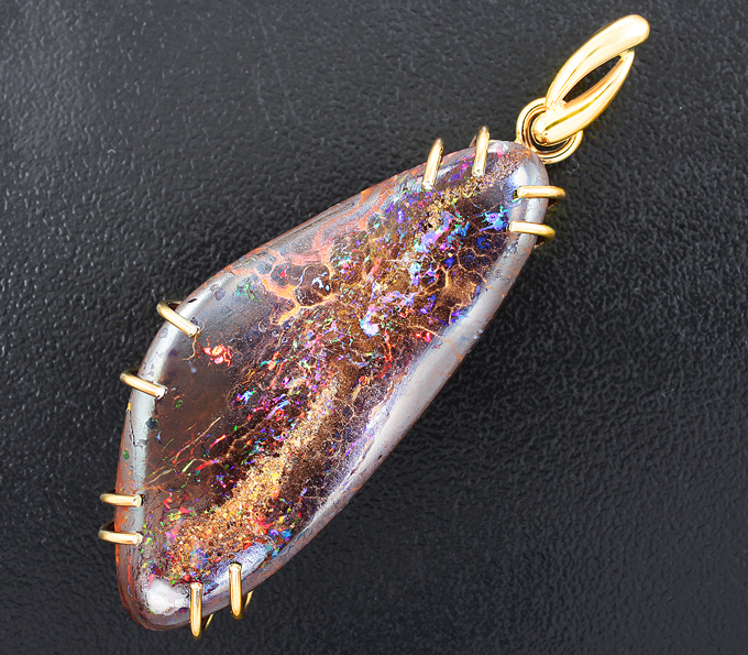 Вашему вниманию предлагается комплект (кольцо + кулон) из желтого золота 585 пробы с австралийскими болдер опалами! Многоцветная бриллиантовая опалесценция красным, желтым, зеленым, синим и фиолетовым цветами. Вес комплекта 15,6 г.