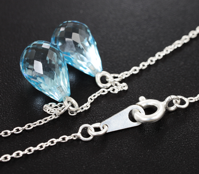 Вашему вниманию предлагается колье из стерлингового серебра (925 проба) с бриолетами голубых топазов! Длина по цепочке 465 мм. Вес изделия 6,9 г. Ниже приводятся ювелирные характеристики вставок.
