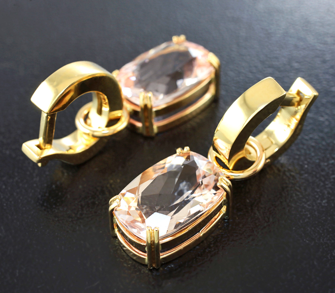 Вашему вниманию предлагаются серьги из желтого золота 585 пробы с морганитами 8,97 карата! Размеры вставок 13 х 9 мм. Размеры серег с петлей 30 х 9 мм. Вес пары 9,1 г.