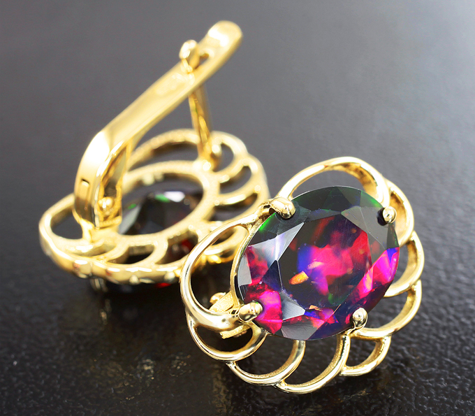 Вашему вниманию предлагаются серьги из желтого золота 585 пробы с ограненными черными опалами! Основные цвета опалесценции: красный, желтый и зеленый. Площадка серег 16 х 12 мм. Вес пары 4 г. Ниже приводятся ювелирные характеристики вставок.