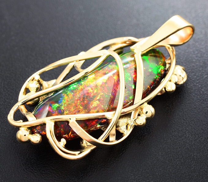 Вашему вниманию предлагается кулон из желтого золота 585 пробы с крупным кристаллическим черным опалом, красными сапфирами и цаворитами гранатами! Основные цвета опалесценции: красный, желтый, зеленый и синий. Диаметр дополнительной инкрустации 2 мм. Размеры кулона с петлей 42 х 22 мм. Вес изделия 8,3 г. Ниже приводятся ювелирные характеристики опала.
