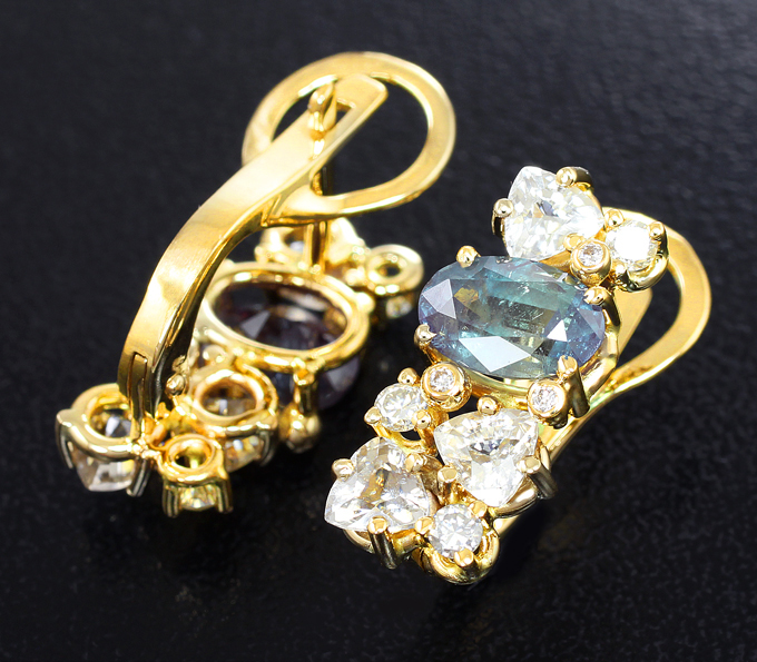 Вашему вниманию предлагаются серьги из желтого золота 585 пробы с уральскими александритами, муассанитами, бесцветными цирконами и бриллиантами! Диаметр дополнительной инкрустации 1,1 мм. Площадка серег 18 х 8 мм. Вес пары 5,1 г. Ниже приводятся ювелирные характеристики вставок.