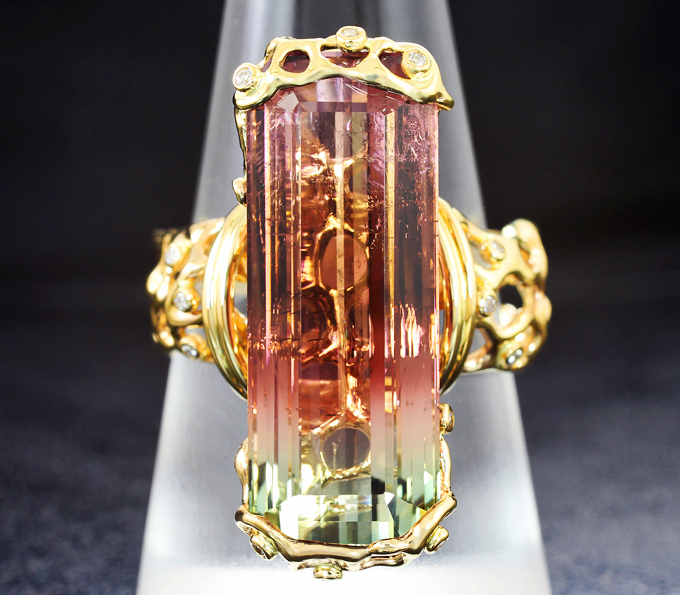 Кольцо с крупным арбузным турмалином 21,53 карата и бриллиантами