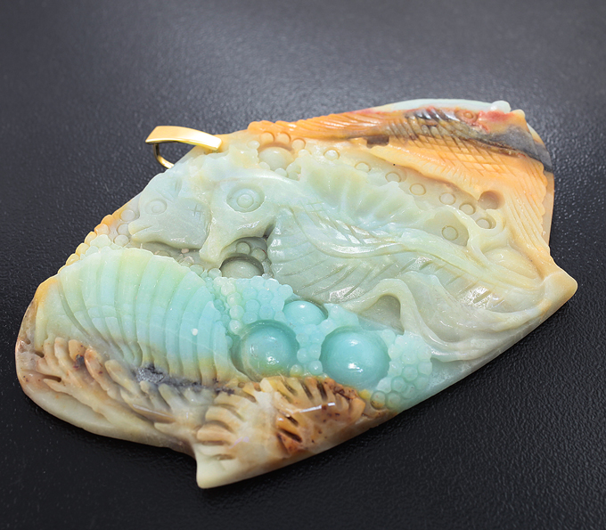 Камея-подвеска «Морской мир» из цельного куска амазонита с золотой петлей